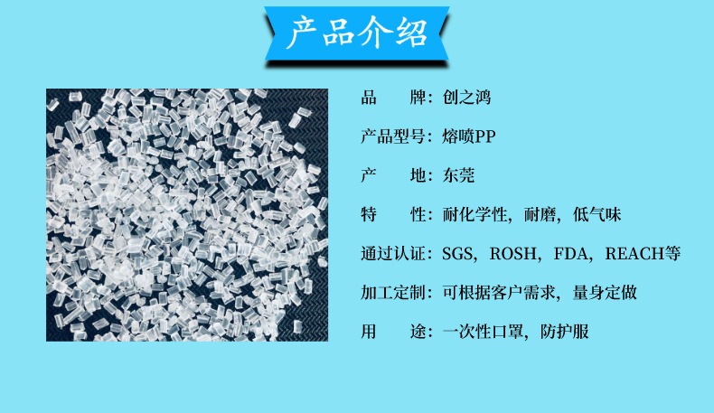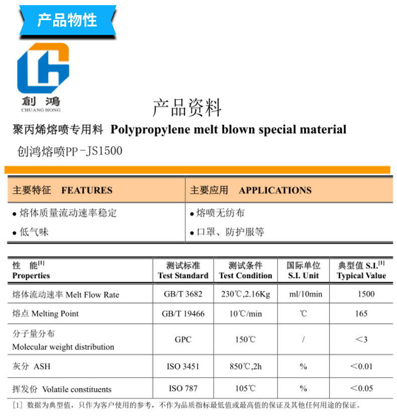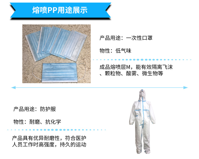 本产品是聚丙烯(PP)熔喷专用料是以聚丙烯为基础原料,采用过氧化物降解,可控流变的方法来改善树脂的流动性及分子量分布。材料具有稳定的综合性能、稳定的高流动性、低碳、环保,分子量分布窄、灰分低、无其他产物残留、优良的纺丝性能等优异特性,应用于一次性口罩布材料和防护服材料。