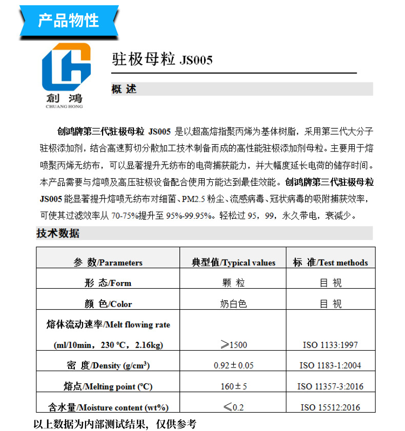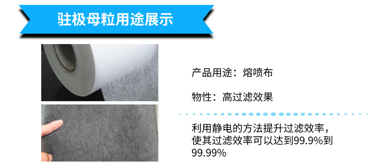 本产品以聚丙烯为基材,采用设备和技术制造使助剂在母粒中达到了亚微米级的分散效果。使用本产品能增加熔喷无纺布中电荷捕集能阱的密度和深度,达到提高熔喷无纺布的综合滤效和抗热衰减的性能。使其在同等纤维细度和克重的情况下,降低无纺布产品的阻力,同时提高无纺布产品的滤效。